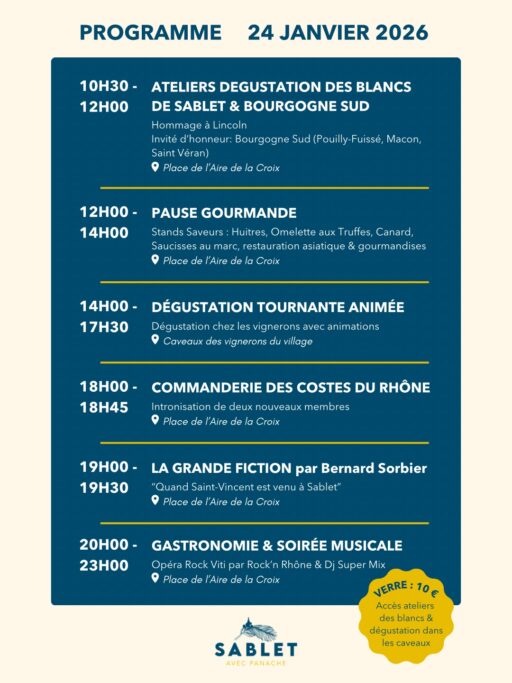 Le 24 janvier 2026, Sablet, charmant village provençal au cœur du Vaucluse, invite visiteurs et amateurs de vins à vivre un moment rare : la première “Grande Saint-Vincent” de l’appellation Côtes-du-Rhône Villages Sablet, une journée festive consacrée à ses vins blancs d’exception.